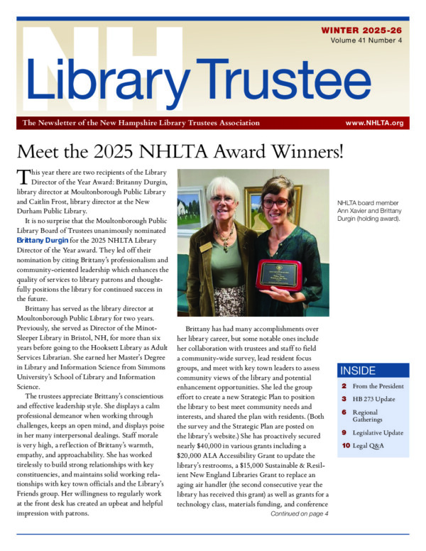 NHLTA has compiled a package of materials for the newly elected trustee as an introduction to understanding the position. The package contains a description of the Library Trustee Board, Code of Ethics, Trustee Job Description and Qualifications, a chart identifying the delegation of responsibilities between the library director and the board, description of Friends of the Library, list of RSAs applicable to libraries and additional resources.